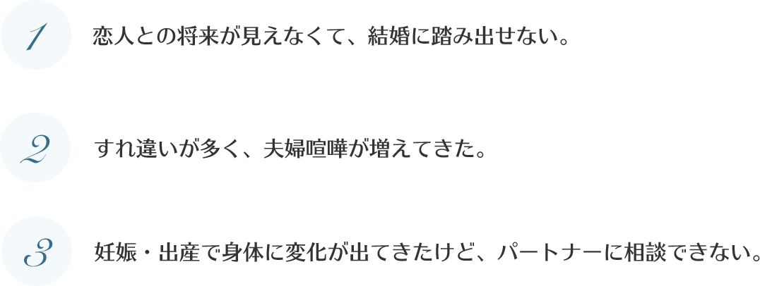 子育てや結婚、職場での人間関係や自身の身体と心の悩みやなど、