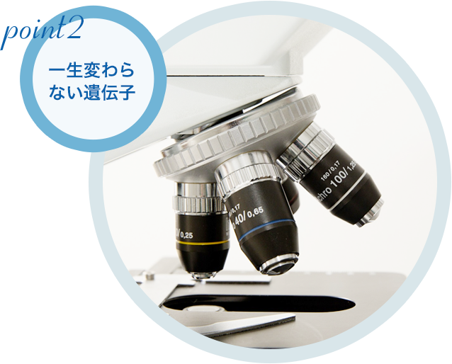 遺伝子とは、人間の体をつくるための設計図のようなものです。体を作り生命を維持するために、いつ・どこで・どれだけ・どんな性質のタンパク質をつくるのかという情報が必要です。それの情報を遺伝子と呼びます。遺伝子を構成しているDNAが異なることにより、背の高さや髪の毛の色、お酒の強さ、病気のかかりやすさ、個人の特性がわかります。人間は99%以上がみな同じ遺伝子配列で構成されて0.1%以下の少しの違いによって人間の個性が決まります。この生まれ持って受け継いだ遺伝子情報は一生変わることがありません。従って遺伝子検査は一生に1回だけしておけば、一生モノの検査結果を得ることができます。SPSの検査機関は一生に一回の大切な検査を完全に国内で検査し、遺伝子のスペシャリストであるDNAアドバイザーがあなたの遺伝子をみながらアドバイスします。